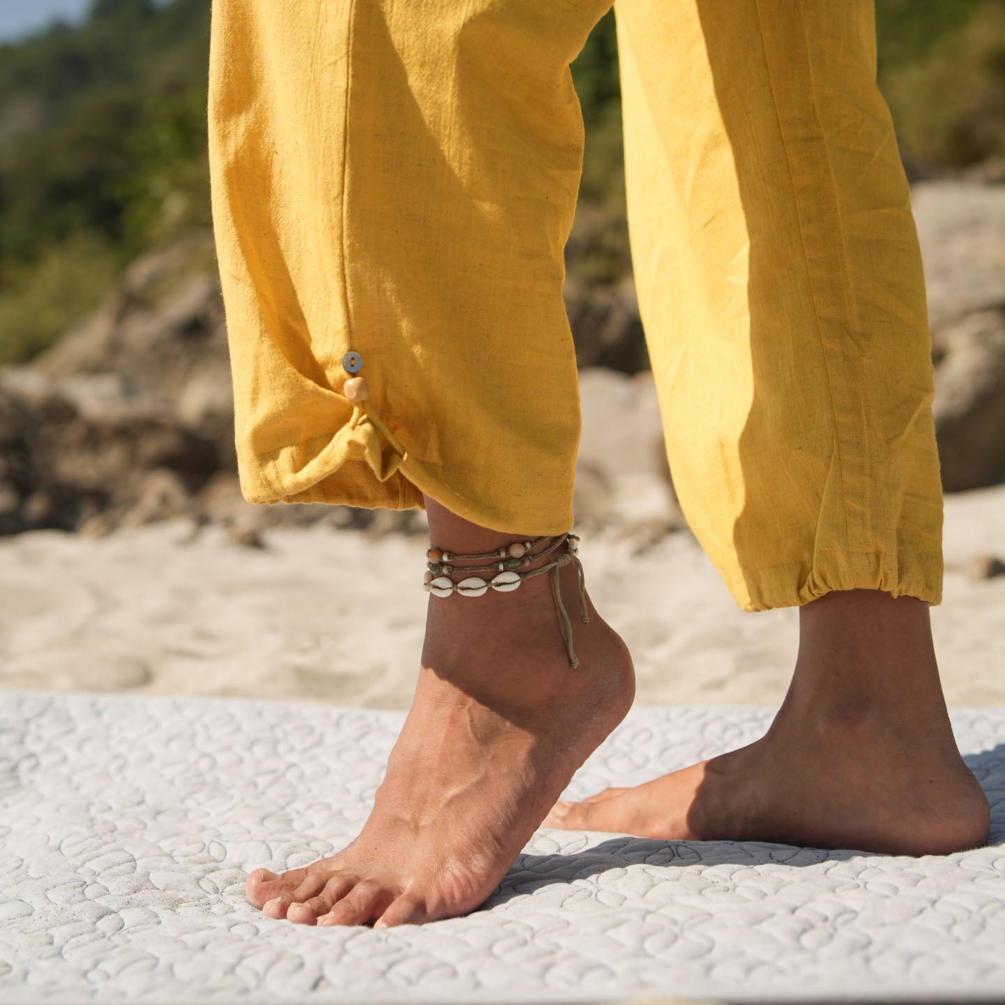 Our tops and pants for women, come with fastenings like drawstrings, wooden beads, buttons and tie ups, that prevent them from riding up during inversions or challenging poses, giving you comfort during practice.
