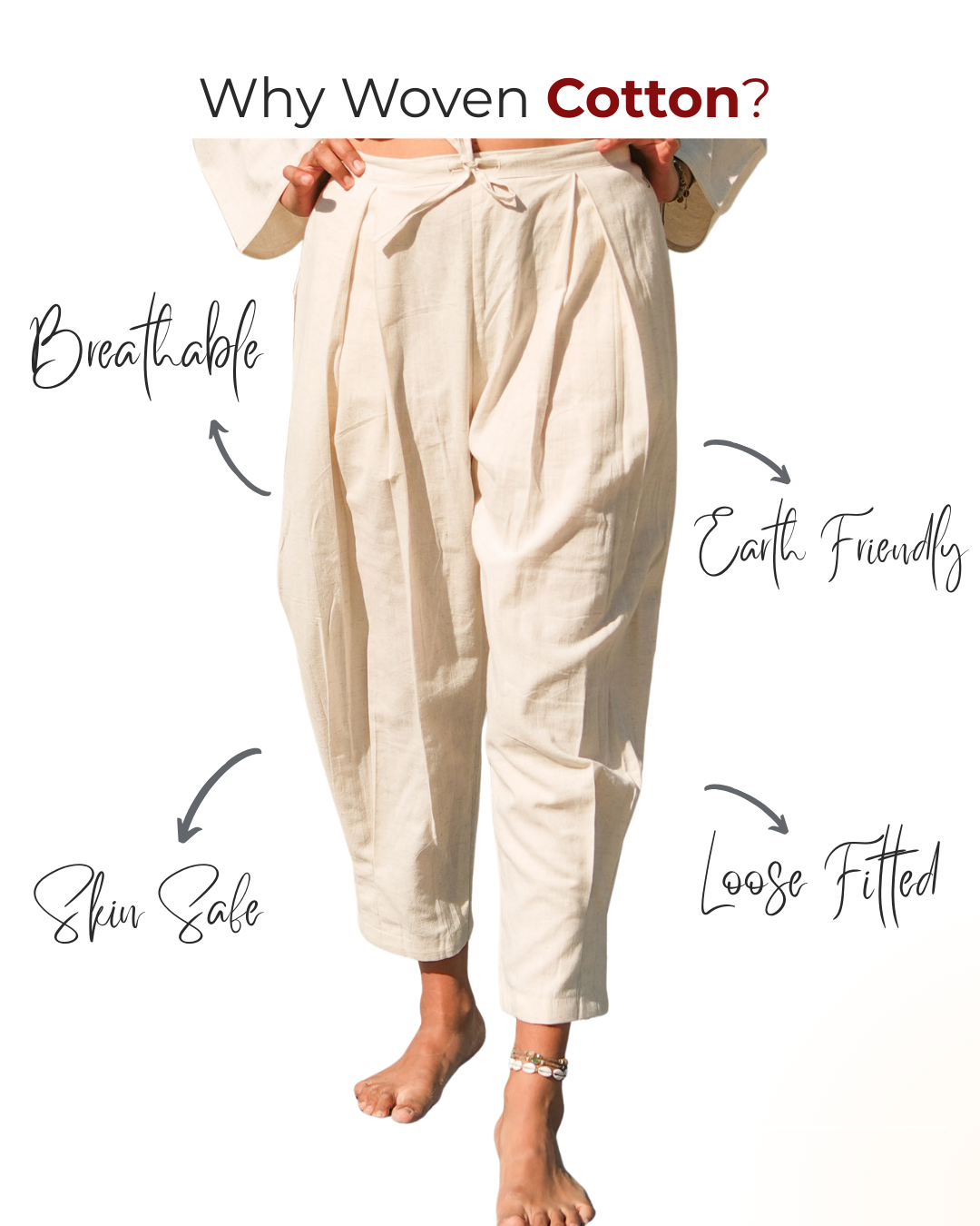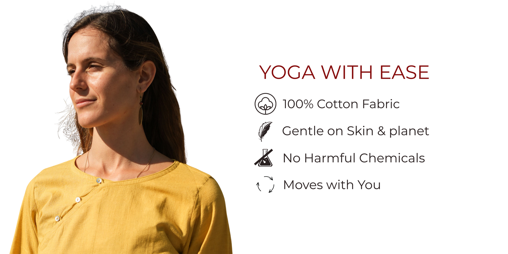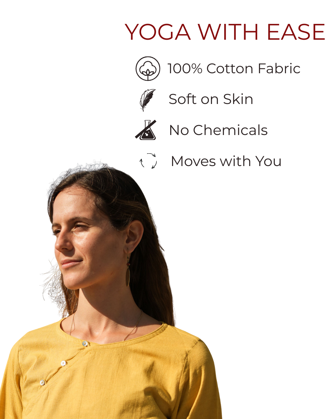 Our tops and pants for women, come with fastenings like drawstrings, wooden beads, buttons and tie ups, that prevent them from riding up during inversions or challenging poses, giving you comfort during practice.