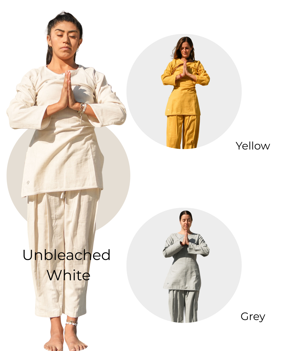 The top with its long silhouette and baggy pants with its narrow ankles ensure ease as you move through various asanas and inversions.