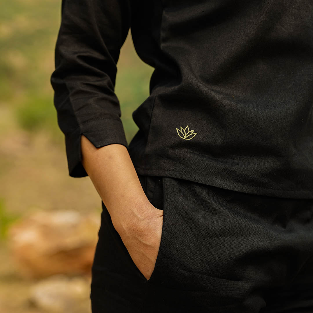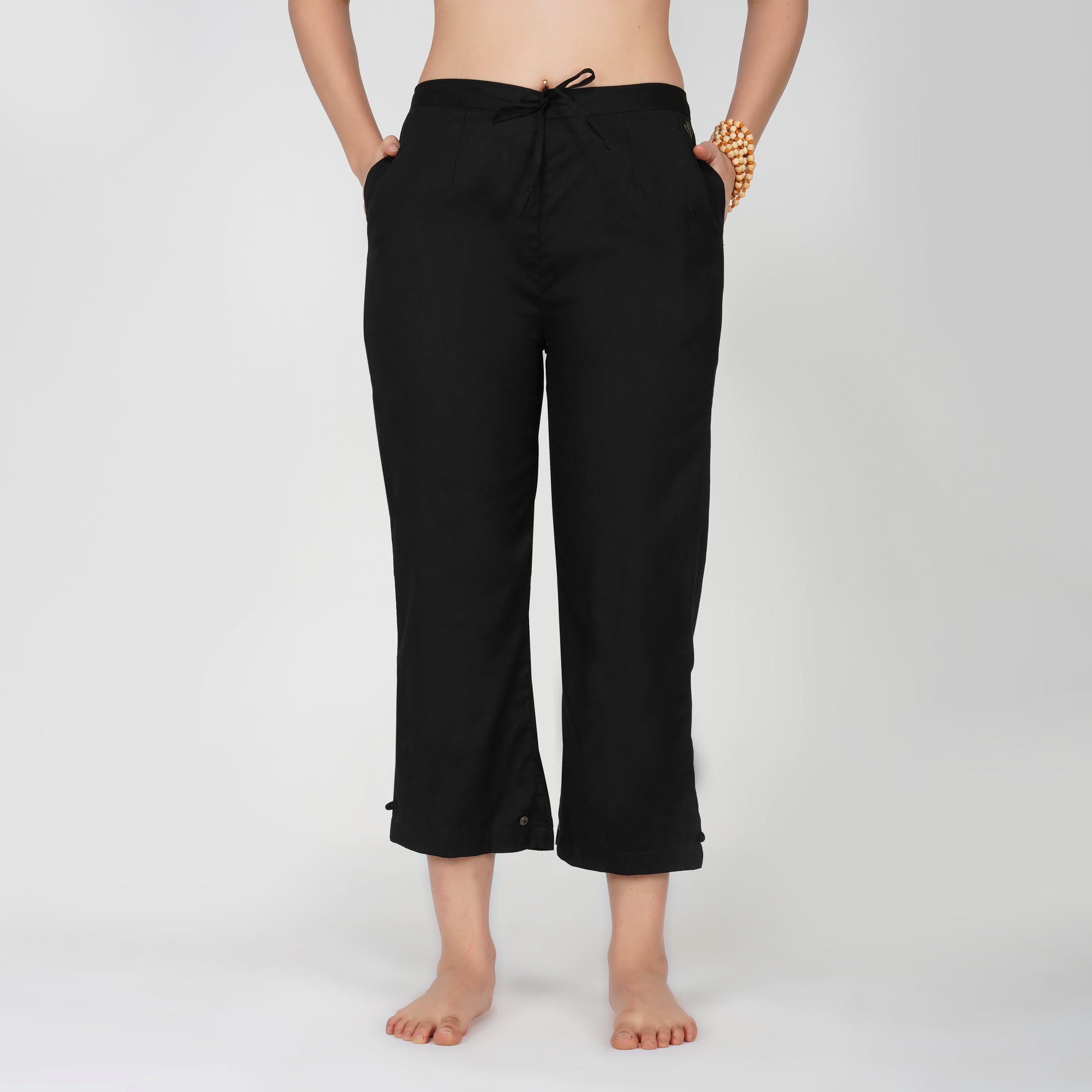 Our tops and pants for women, come with fastenings like drawstrings, wooden beads, buttons and tie ups, that prevent them from riding up during inversions or challenging poses, giving you comfort during practice.