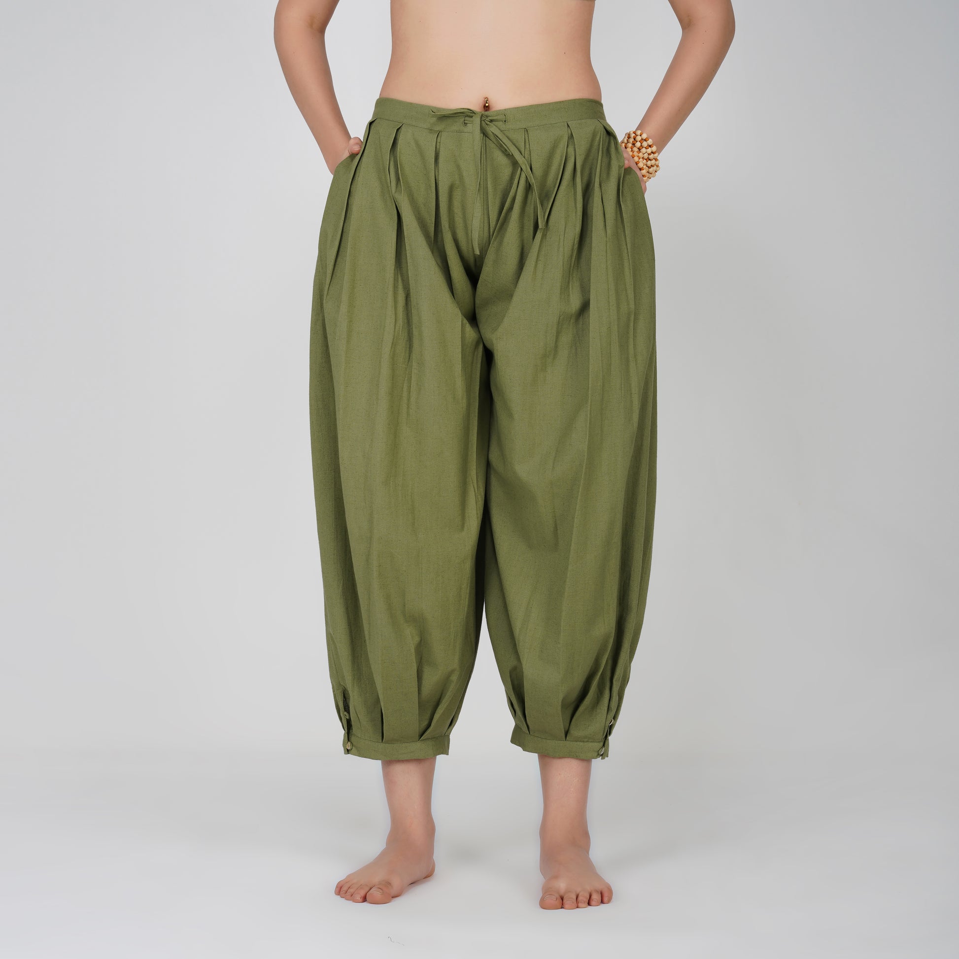 Our tops and pants for women, come with fastenings like drawstrings, wooden beads, buttons and tie ups, that prevent them from riding up during inversions or challenging poses, giving you comfort during practice.