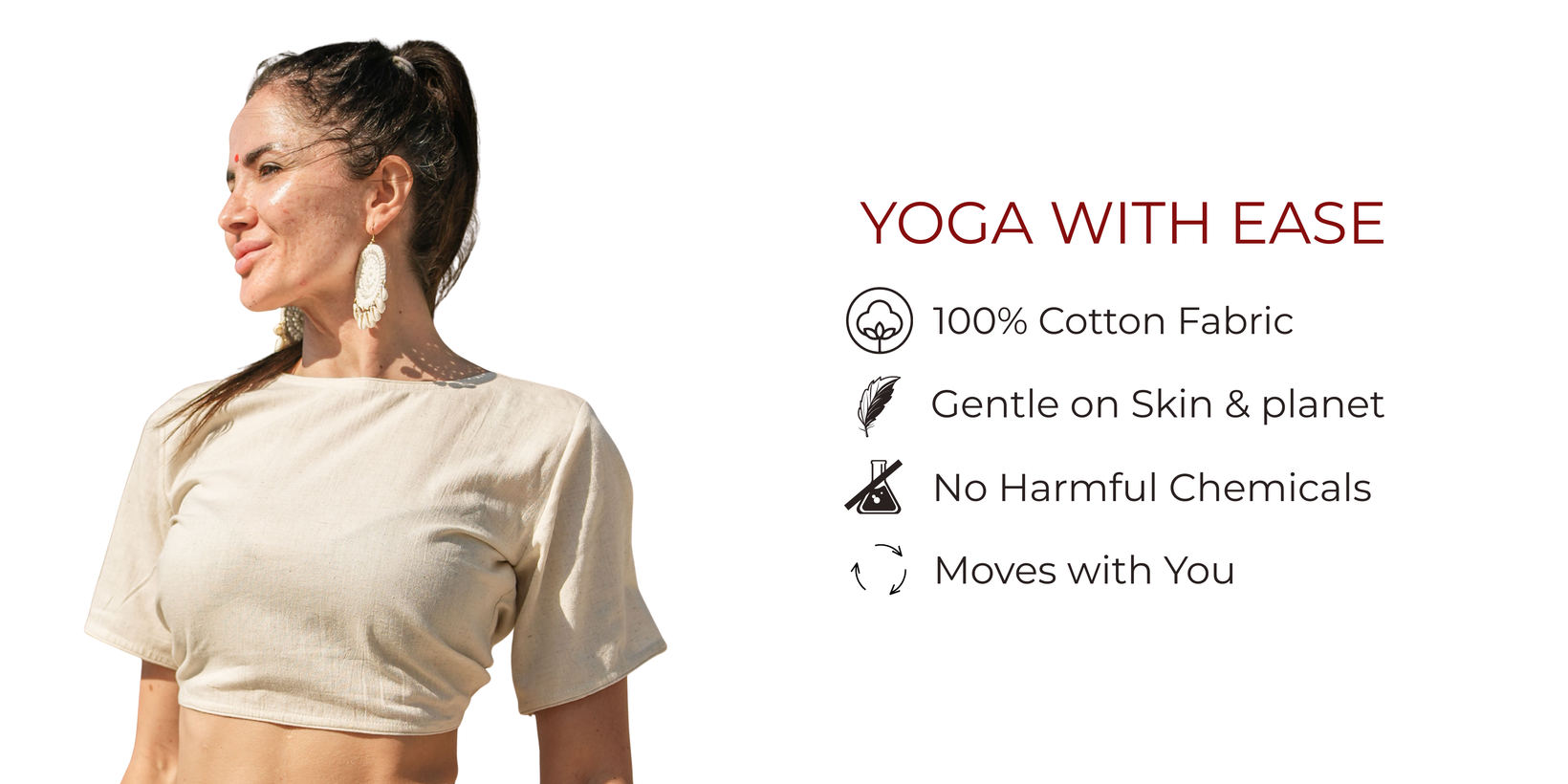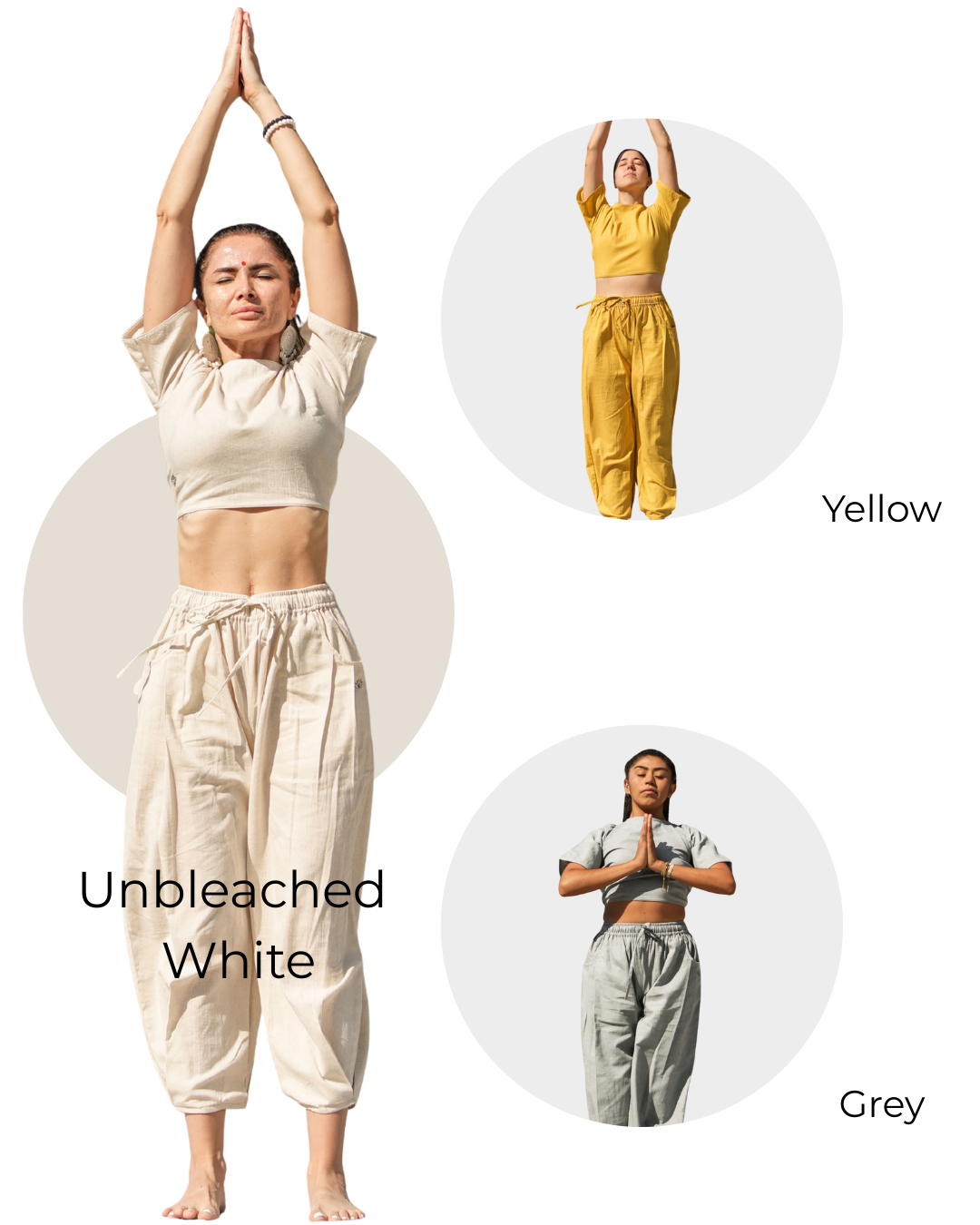 Our tops and pants for women, come with fastenings like drawstrings, wooden beads, buttons and tie ups, that prevent them from riding up during inversions or challenging poses, giving you comfort during practice.