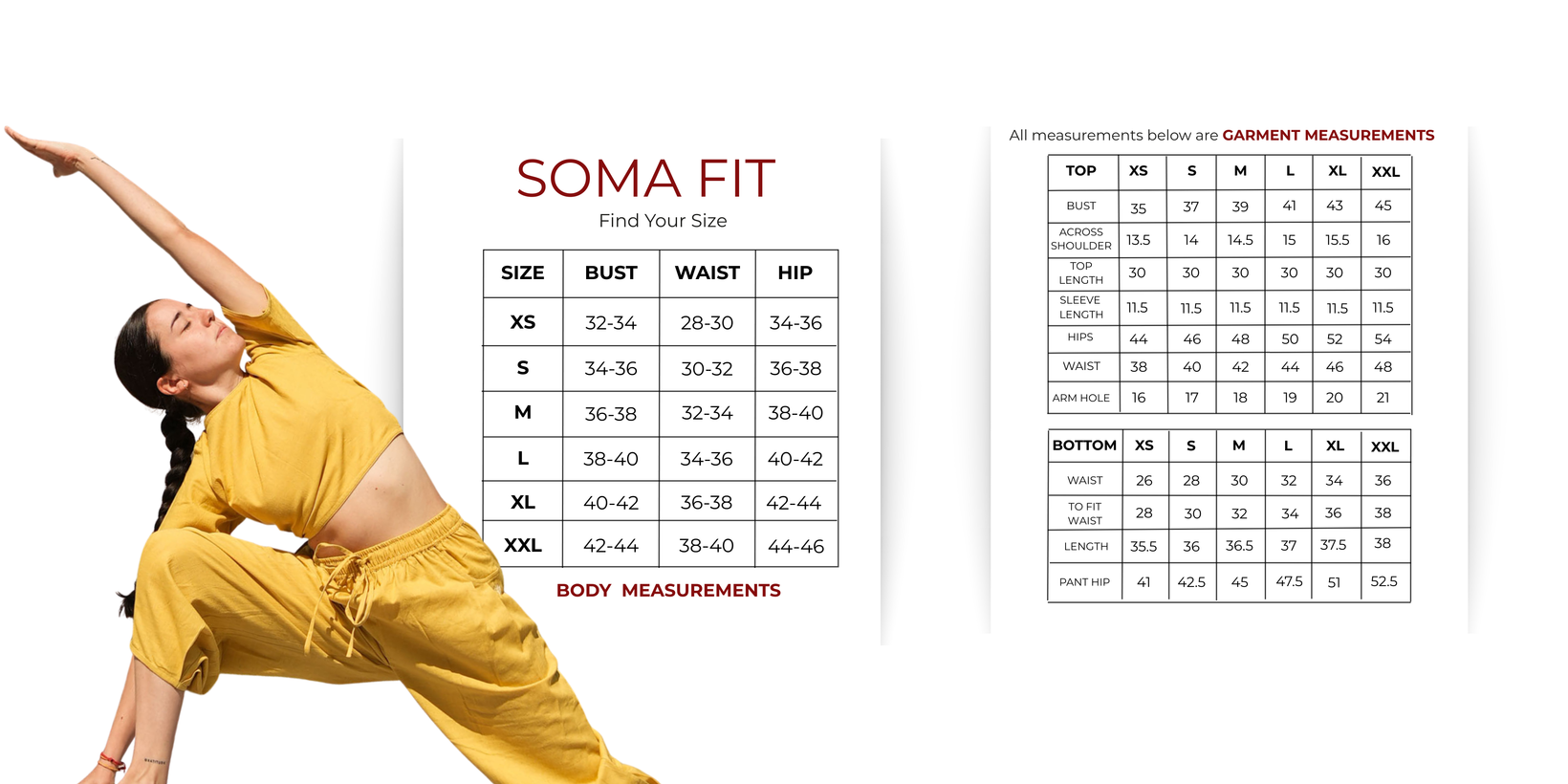 While you practice yoga the garment will need to move with you. When in doubt we encourage you to buy a size bigger for ease of movement as you do different asanas.
