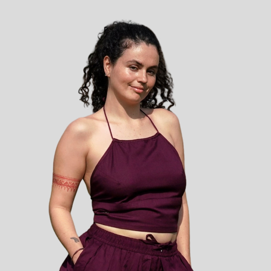 The AKASHA top Purple is made from 100% cotton. The backless top comes with thread ties to secure it in place at the neck and back, designed to allow you to flow and move with ease.
