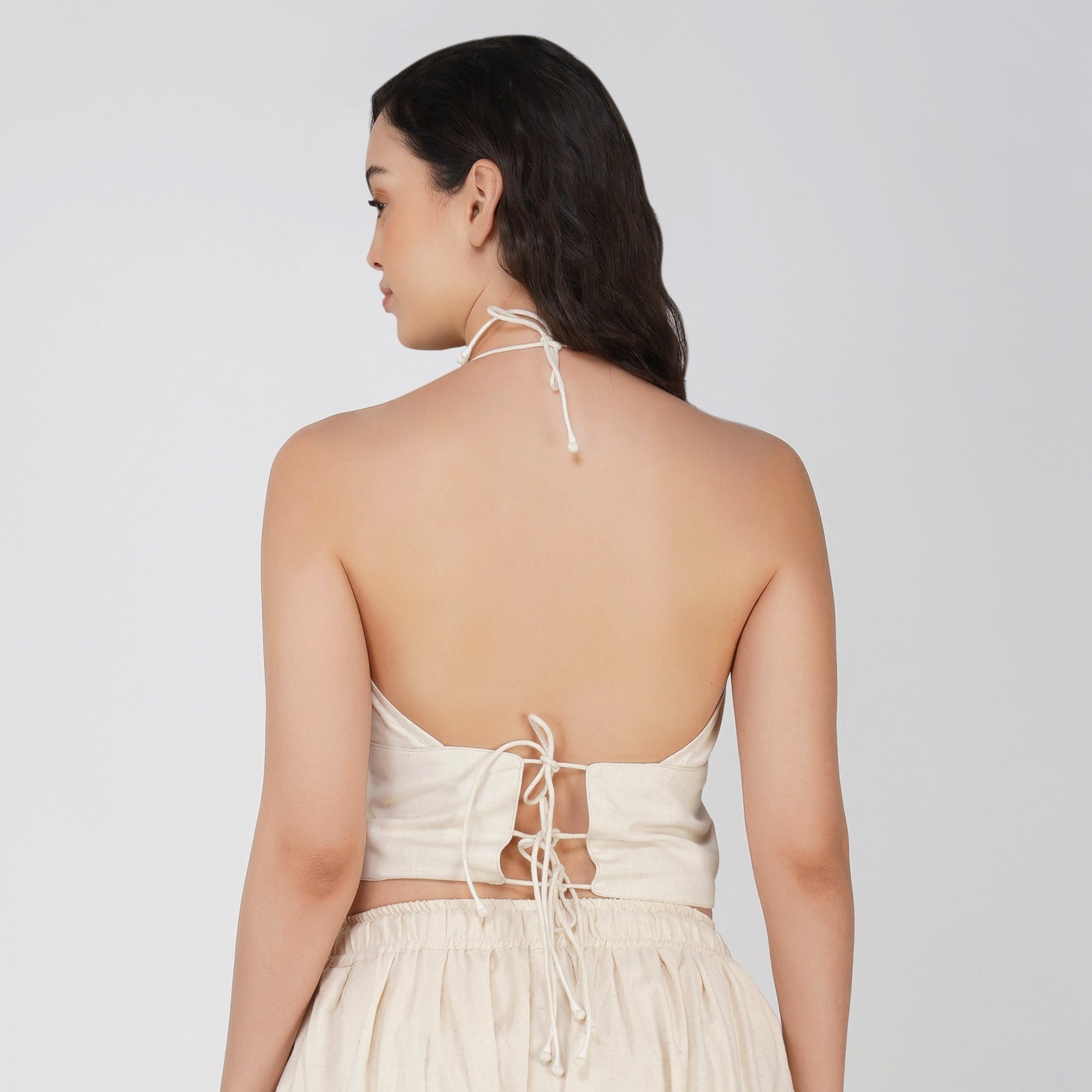 The AKASHA top is made from unbleached 100% cotton. The backless top comes with thread ties to secure it in place at the neck and back, designed to allow you to flow and move with ease.