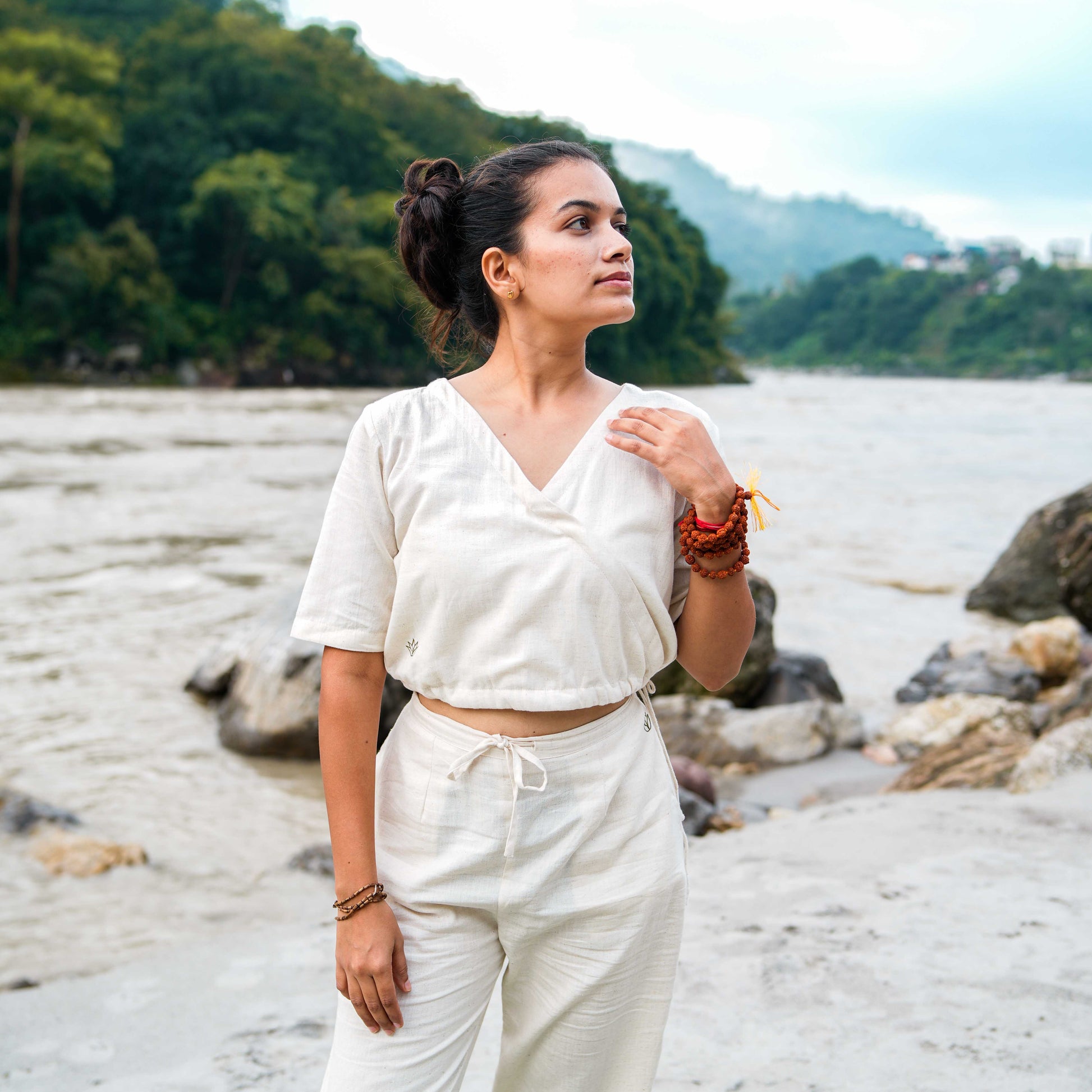 Our tops and pants for women, come with fastenings like drawstrings, wooden beads, buttons and tie ups, that prevent them from riding up during inversions or challenging poses, giving you comfort during practice.