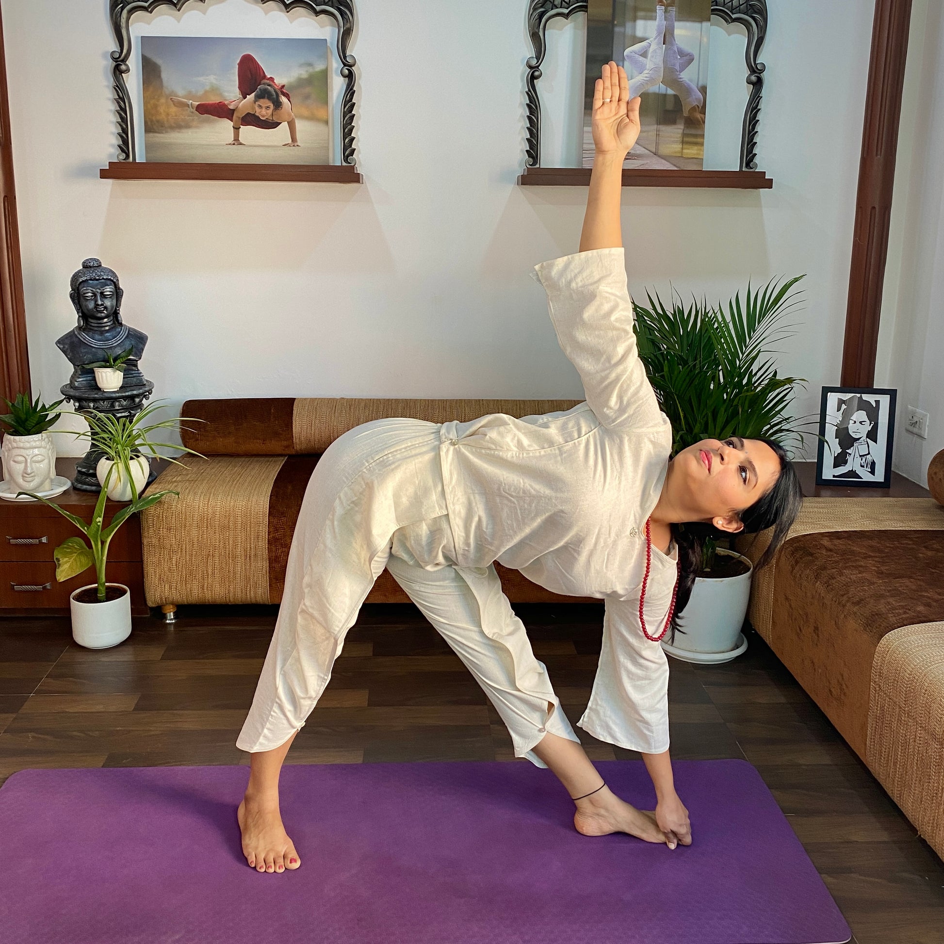 Our tops and pants for women, come with fastenings like drawstrings, wooden beads, buttons and tie ups, that prevent them from riding up during inversions or challenging poses, giving you comfort during practice.